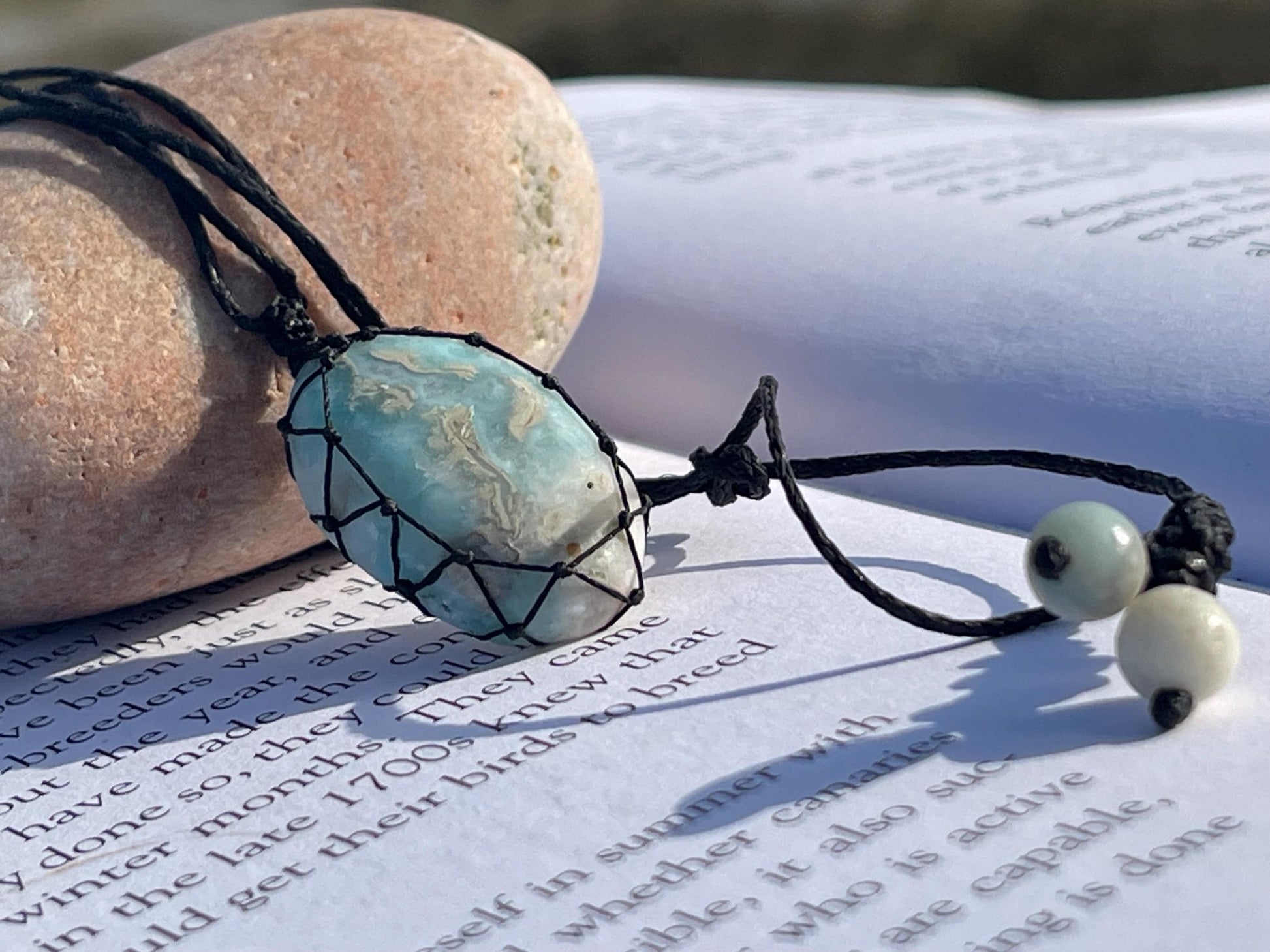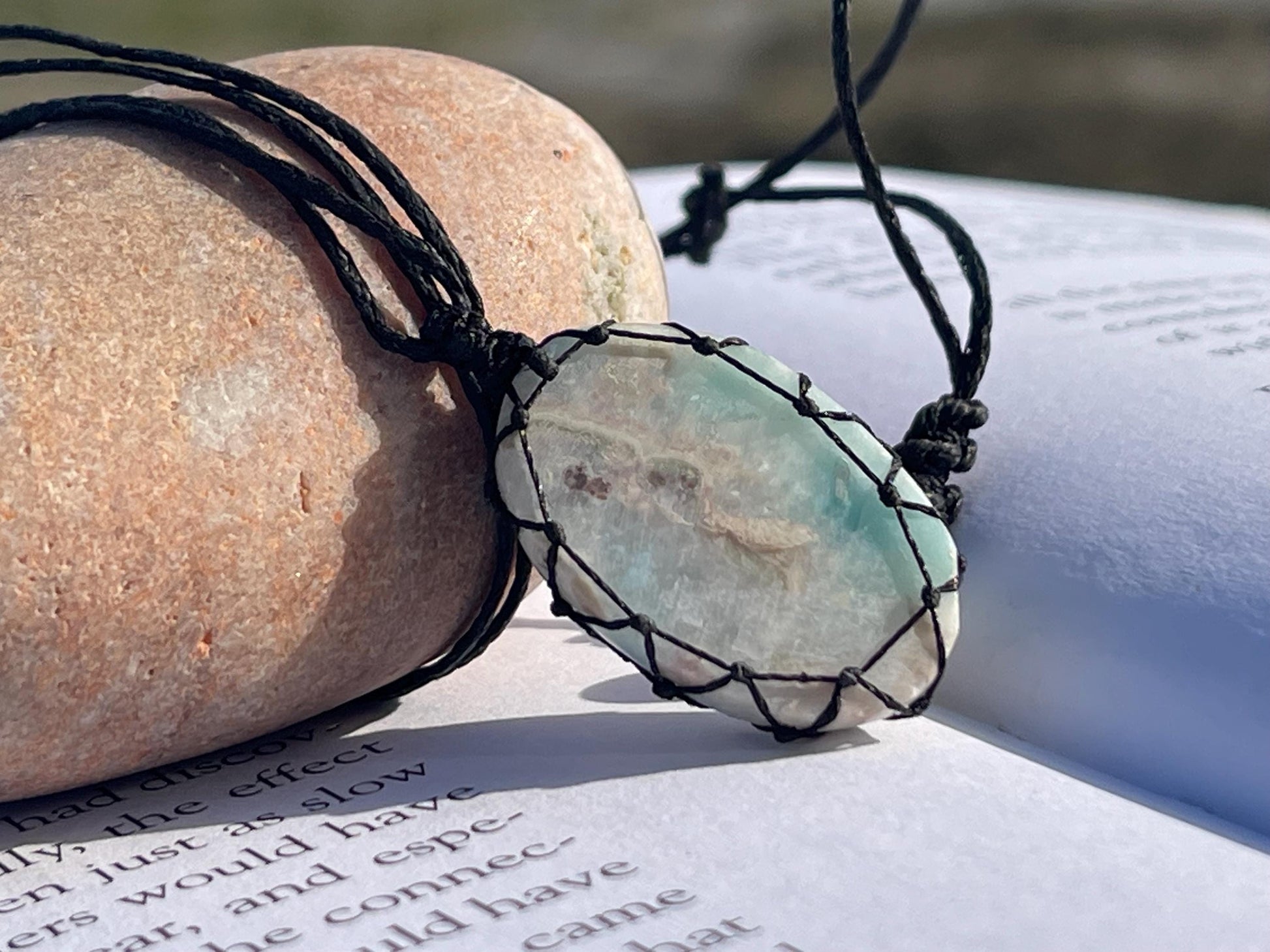Stunning macrame Larimar necklace on an adjustable cord. Handmade gemstone necklace, boho jewellery. Macrame jewellery. Unique necklace.