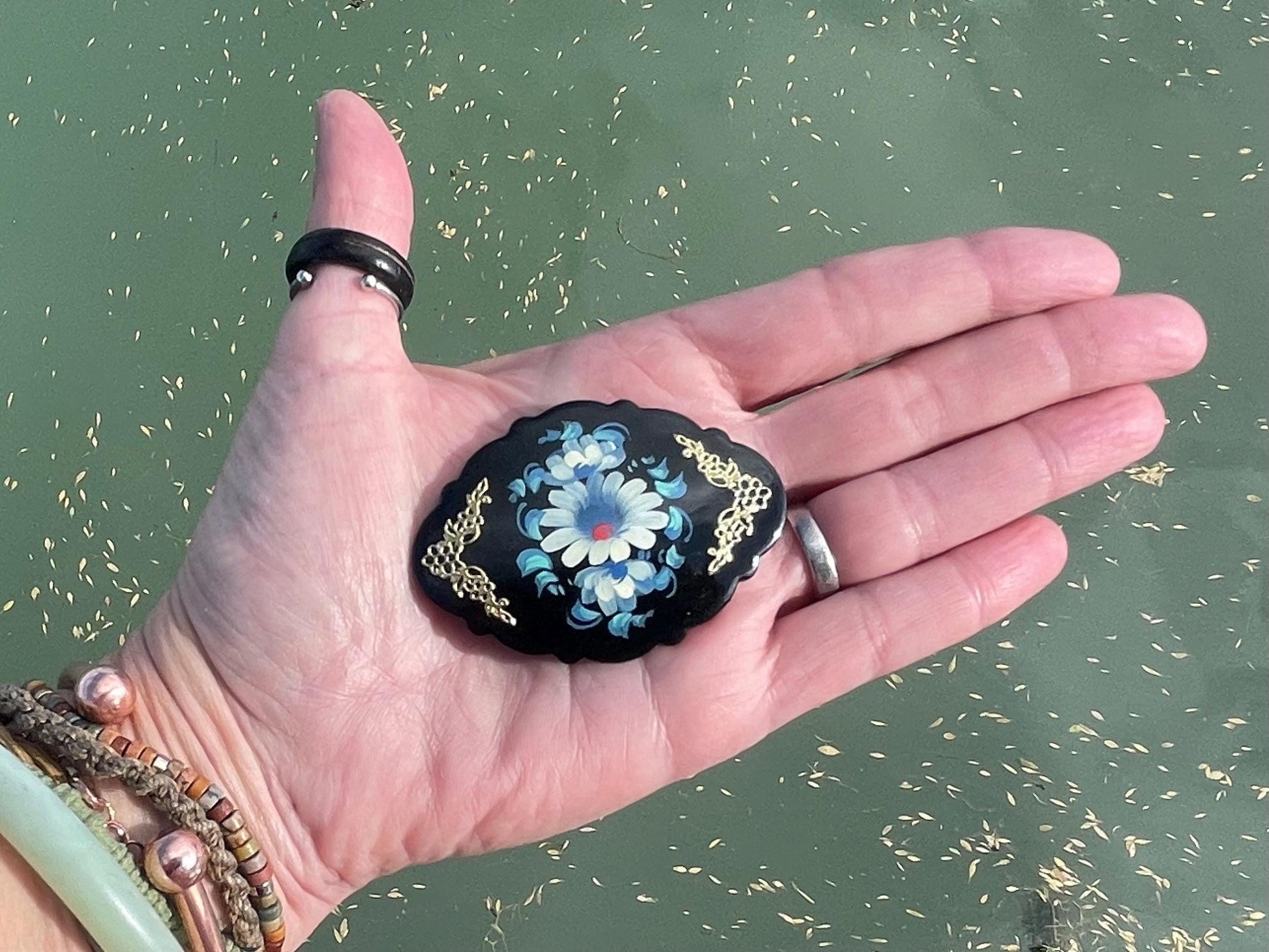 The brooch features a floral design with white and blue flowers and a gold-colored border. 6cms.