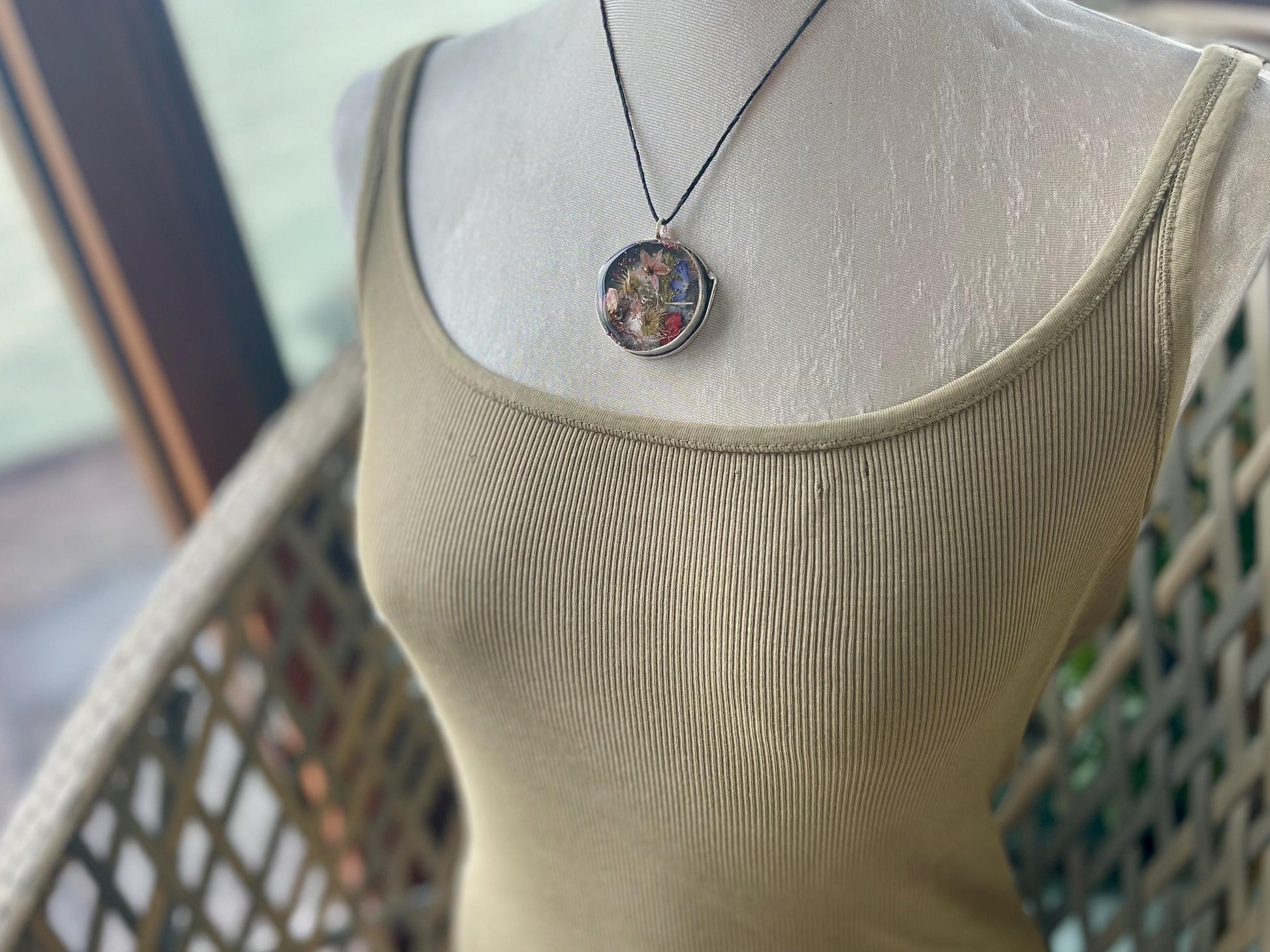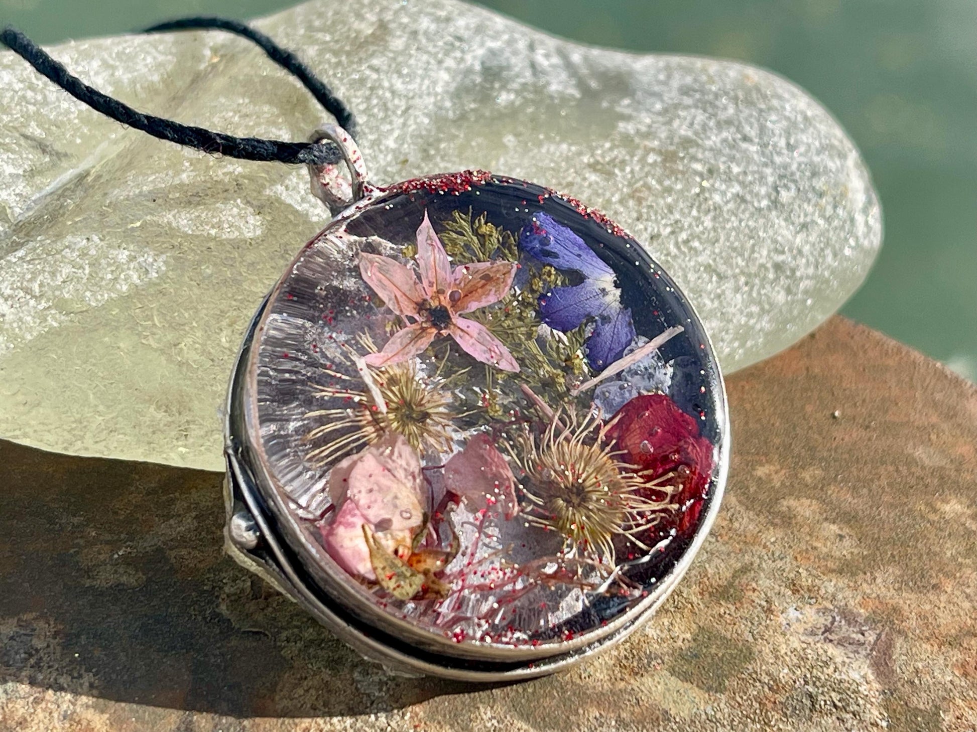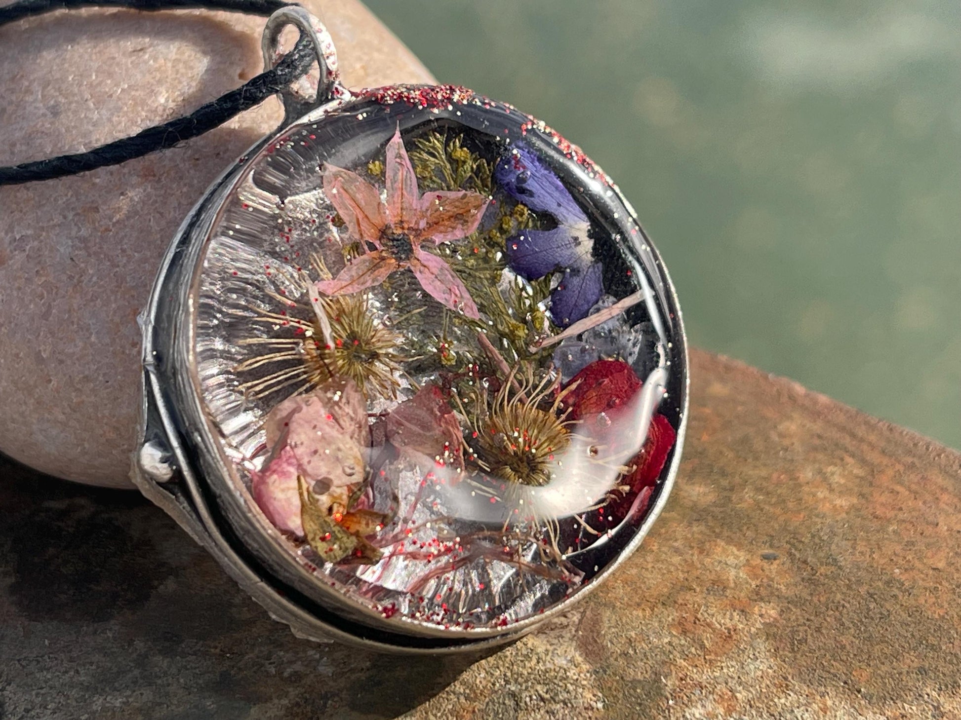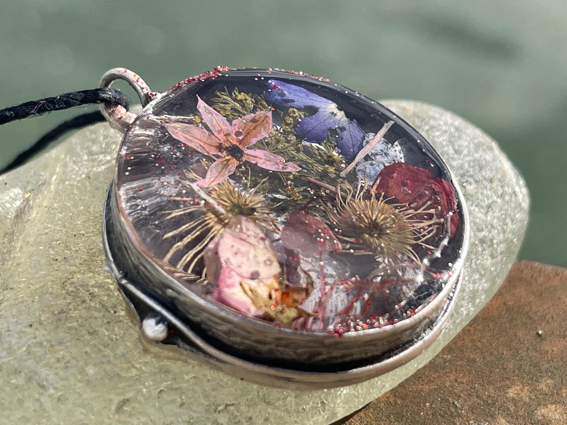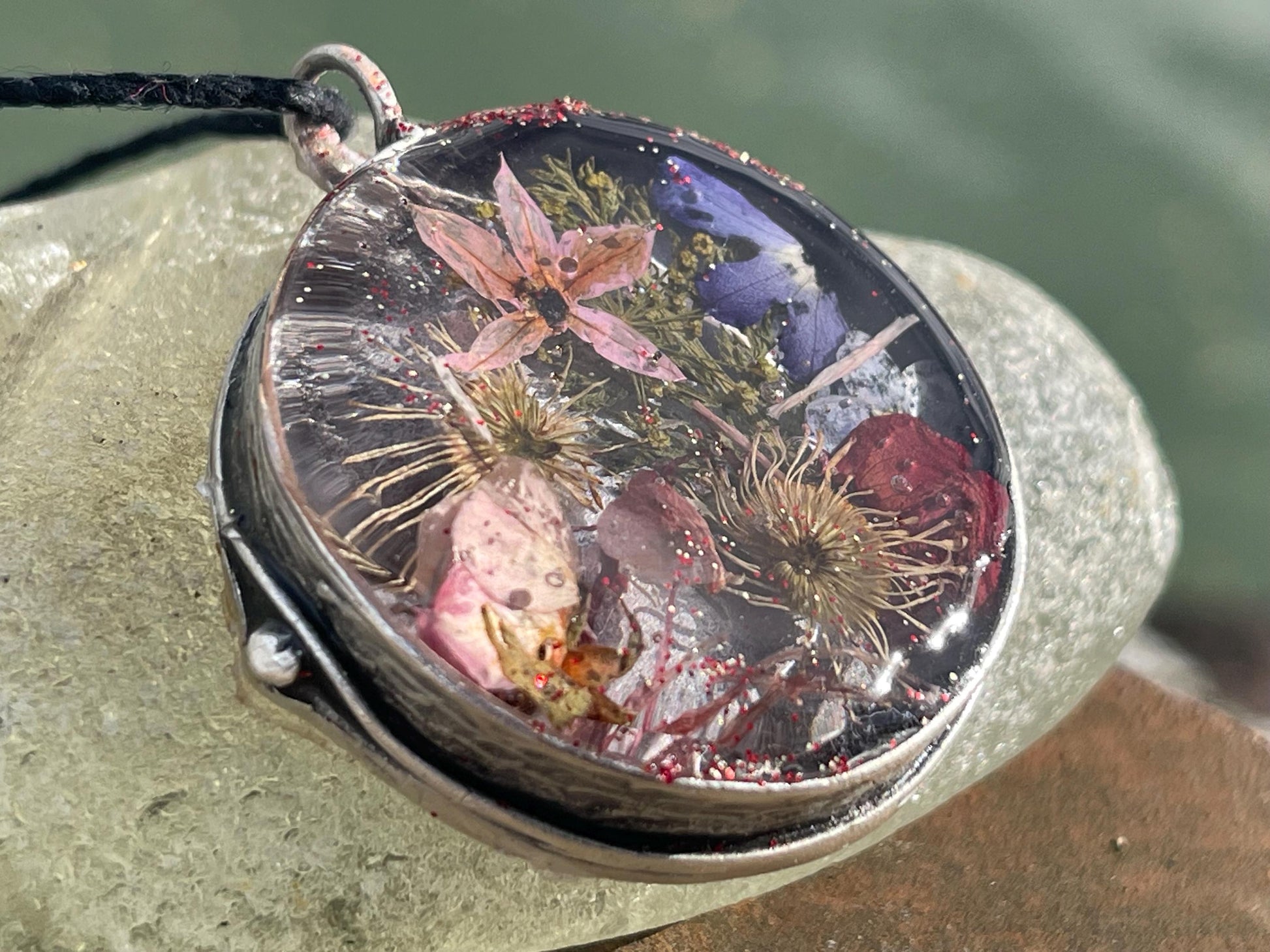 The flowers are framed on silver plated brass and hung on hemp - left loose so you can tie at your preferred length.